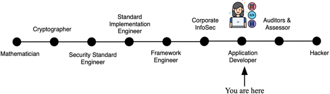 Security spans a continuum of roles—from mathematicians and cryptographers to standards authors, implementers, framework builders, corporate security teams, and auditors—each contributing different expertise. Developers don’t need deep mathematical knowledge, but they do need to understand what algorithms and standards do, when to use them, and how to integrate them properly to pass audits and protect users. This book focuses on that practical developer skill set: building a clear mental model of security, applying core cryptography, using common protocols and identity patterns, securing service-to-service communication, avoiding common coding pitfalls, and collaborating effectively with InfoSec to ship trustworthy software.