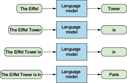 To generate full sentences, the LLM wrapper used the LLM to generate one word, then attached that word to the initial prompt, then used the LLM again to generate one more word, and so on.