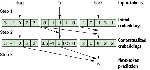 LLM overview. In step 1, the tokens are mapped to embeddings one by one. In step 2, each embedding is improved by contextualizing it using the previous tokens in the prompt. In step 3, the much-improved embeddings are used to make predictions about the next token.