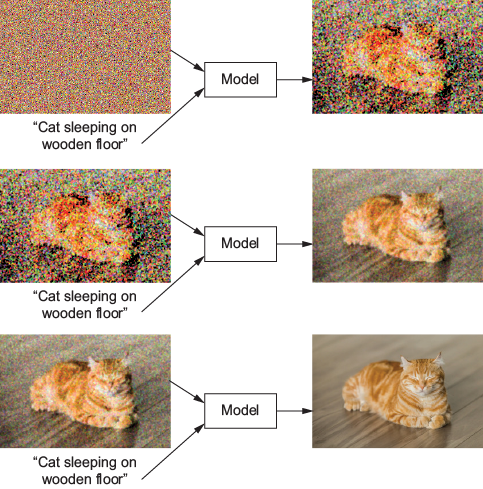 A diffusion model is used repeatedly to have a desired image emerge from Gaussian noise.