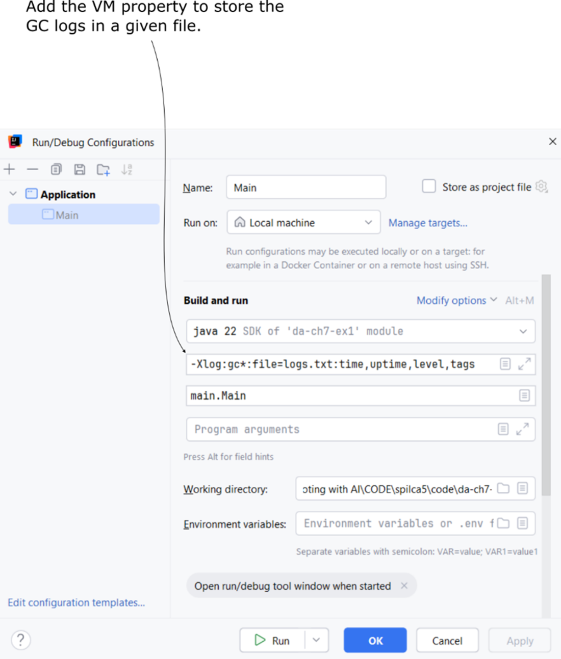 Enabling the GC logs in IntelliJ IDEA running configuration to display the GC logs in the execution console.