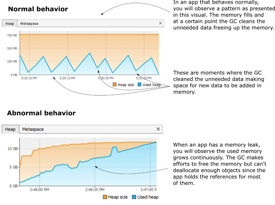 - Insufficient heap: frequent GCs (including Full GCs) that reclaim a meaningful amount; heap shows peaks and valleys; app remains stable but slow. - Leak: GCs reclaim little; heap steadily rises toward max; eventual crashes. Actions: - Insufficient heap: increase-Xmx/-Xms or scale out; optimize allocations.